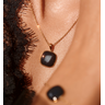 Naszyjnik na delikatnym, złotym łańcuszku z minimalistyczną zawieszką w kształcie miękko zaokrąglonego kwadratu subtelnie podkreśla dekolt. Kolczyki wkrętki z granatową emalią rozświetlają twarz i stanowią idealne rozwiązanie zarówno na co dzień, jak i na bardziej formalne okazje. Bransoletka z cienkim łańcuszkiem i centralnym elementem z emalią delikatnie akcentuje nadgarstek, a pierścionek dopełnia całość, tworząc spójny, elegancki zestaw.