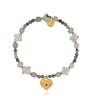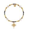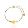 Górna bransoletka przyciąga uwagę większym, miodowym kamieniem, który nadaje całości wyrazistości i pięknie podkreśla ciepły odcień skóry. Środkowa została ozdobiona złotym sercem z promienistym wzorem – symbolem światła i pozytywnej energii. Dolna bransoletka z delikatną koniczynką dodaje całości lekkości i subtelnego szczęśliwego akcentu. Drobne, fasetowane kamienie i złote kuleczki delikatnie odbijają światło, tworząc elegancki efekt bez przesady.