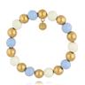 Bransoletka z kulkami to z kolei lekkość i dziewczęcy akcent. Złote, połyskujące kule w zestawieniu z matowym błękitem i kremową bielą tworzą modny, ale ponadczasowy rytm kolorystyczny. Elastyczna forma dopasowuje się do nadgarstka, dzięki czemu sprawdzi się zarówno w codziennych stylizacjach, jak i podczas wyjątkowych okazji.