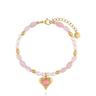 Każda bransoletka ma swój wyjątkowy charakter. Jedna wyróżnia się złotą zawieszką z różowym kamieniem w oprawie w kształcie serca, inna delikatnym medalionem z masy perłowej, kolejna zachwyca rzędem drobnych serduszek z kwarcu. Złote kuleczki i przekładki dodają całości ciepłego blasku i pięknie kontrastują z pastelową paletą barw.