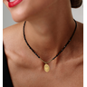 Pierwszy model to delikatny choker z drobnych, czarnych koralików przełamanych złotymi akcentami. W centrum znajduje się owalna zawieszka o promienistej fakturze z małym sercem – detalem, który nadaje biżuterii kobiecej lekkości i symbolicznego znaczenia. Kontrast czerni i złota sprawia, że naszyjnik wygląda nowocześnie, ale jednocześnie bardzo elegancko.