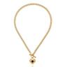 Drugi naszyjnik to masywniejszy, złoty łańcuch o wyrazistym splocie typu chain, wykończony ozdobnym zapięciem toggle z przodu. Zawieszka w kształcie serca z promienistą fakturą oraz centralnym, czarnym elementem tworzy mocny, stylowy akcent. To detal, który nadaje całości charakteru i sprawia, że stylizacja staje się bardziej zdecydowana.