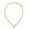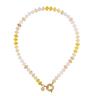 Górny naszyjnik z drobnych, płaskich koralików w odcieniach piasku i karmelu pięknie przylega do szyi. Delikatne złote przekładki dodają mu elegancji i podkreślają ciepły ton całości.