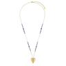 Drugi, dłuższy naszyjnik ma bardziej minimalistyczny charakter. Cienki łańcuszek przeplatany drobnymi granatowymi kamieniami prowadzi wzrok do centralnego elementu – gładkiej, złotej zawieszki w kształcie serca. Serce o miękkiej, zaokrąglonej formie odbija światło i nadaje całości romantycznego, a jednocześnie nowoczesnego charakteru.