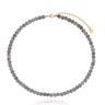 Krótszy naszyjnik z drobnych, fasetowanych kamieni w odcieniu szarości z delikatnym nakrapianiem pięknie podkreśla linię szyi. Jego struktura i subtelny połysk sprawiają, że całość wygląda lekko, ale bardzo szlachetnie. Dłuższy model z większych, gładkich, jasnych kamieni naturalnych miękko układa się na dekolcie, nadając stylizacji świeżości i elegancji.