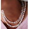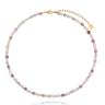 Pierwsza warstwa z drobnych, fasetowanych kamieni w odcieniach pudrowego różu, mlecznej bieli i jasnego błękitu delikatnie podkreśla linię szyi. Druga – z nieco większych, nieregularnych kulek – dodaje głębi i naturalnego charakteru. Najbardziej wyrazista warstwa z większych, matowych kamieni w pastelowych tonach buduje efekt i nadaje całości modowego wyrazu.