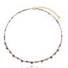Krótszy naszyjnik z drobnych, fasetowanych kamieni w odcieniach różu, pudru i przygaszonej szarości subtelnie podkreśla linię szyi. Delikatne złote przekładki dodają mu elegancji i sprawiają, że pięknie odbija światło.