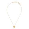Drugi naszyjnik to delikatny, cienki łańcuszek w złotym wykończeniu z zawieszką w kształcie serca. Złote serce ma ażurową, dekoracyjną strukturę z błyszczącymi akcentami, które subtelnie odbijają światło. To detal, który wprowadza elegancję i przełamuje pastelową miękkość górnego naszyjnika.