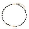 Pierwszy naszyjnik, subtelny i lekki, pięknie układa się przy szyi. Czarne, połyskujące koraliki przełamane złotymi detalami i drobną perełką dodają elegancji i tworzą idealną bazę pod kolejną warstwę.