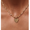 Pierwszy naszyjnik z drobnych, fasetowanych kamieni w jasnym, kremowo-beżowym odcieniu przyciąga subtelnym połyskiem. Przełamany złotymi kuleczkami i wykończony zawieszką w kształcie serca o fakturowanej powierzchni, dodaje całości romantycznego akcentu. Serce nie jest gładkie – delikatny wzór nadaje mu wyjątkowej struktury i sprawia, że światło odbija się w nieoczywisty sposób.