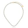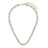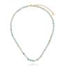 Najkrótszy naszyjnik z drobnych, jasnych kamieni delikatnie podkreśla linię szyi, środkowy model z większymi miętowymi koralikami przyciąga uwagę subtelnym kolorem inspirowanym naturą, a najdłuższy – z drobnymi błękitnymi kamieniami – wprowadza lekkość i przestrzeń w całej kompozycji. Złote przekładki nadają całości szlachetnego charakteru i pięknie odbijają światło.
