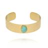 W centrum zestawu znajduje się szeroka, złota bransoleta o młotkowanej powierzchni. Jej nieregularna faktura pięknie odbija światło, tworząc efekt głębi i naturalnego blasku. Ozdobiona owalnym kamieniem w turkusowym odcieniu staje się wyrazistym punktem całej stylizacji – subtelnym, ale zauważalnym.